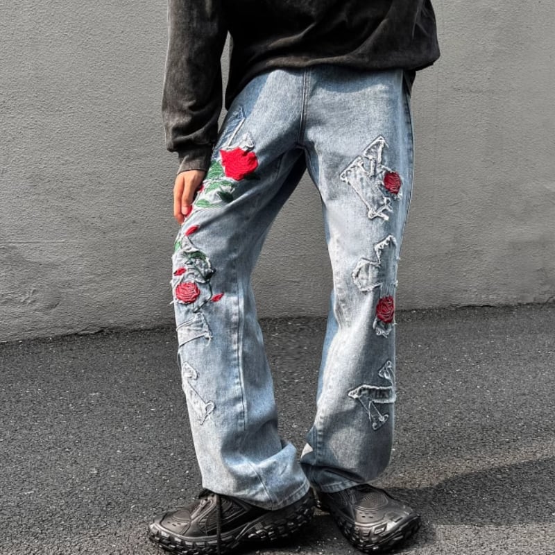 【FLEX0472】Rose Embroidered Logo Damaged Denim