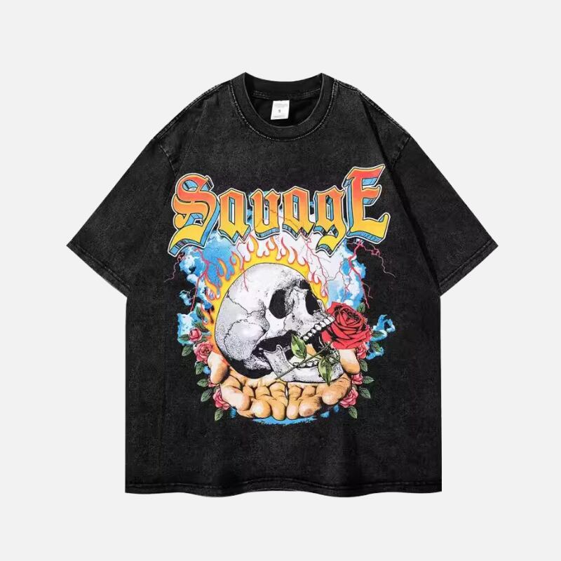 【FLEX0800】Rose Skull Design Vintage Finished Tee